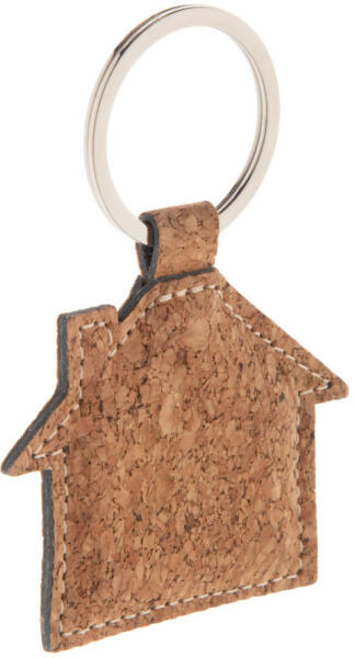 Ház formájú, természetes parafából és PU bőrből készült kulcstartó fém karikával.