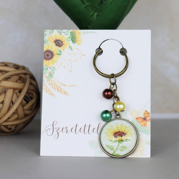 Üveglencsés kulcstartó, napraforgó mintával és teklagyöngyökkel.