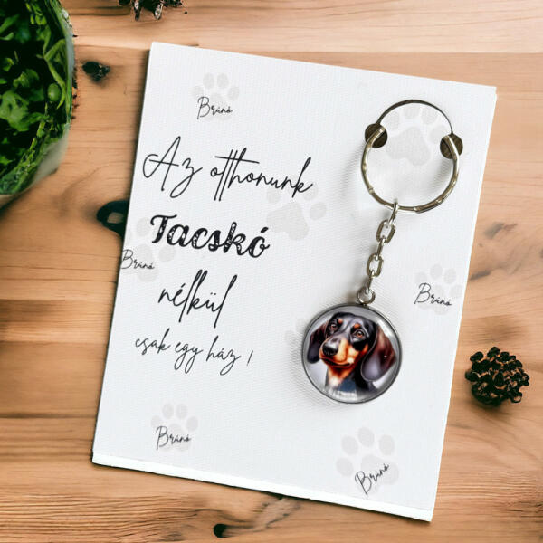 Üveglencsés tacskós kulcstartó, fém karikára fűzve.