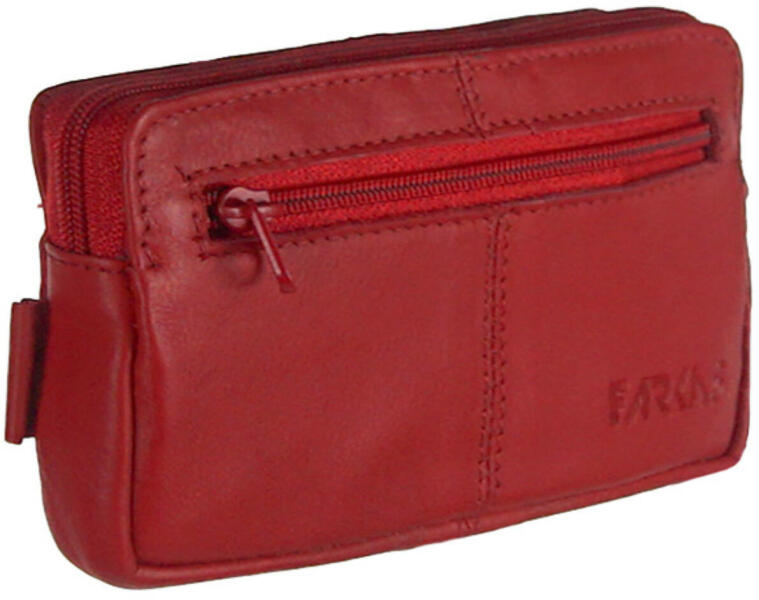 Puha, matt piros bőrből készült 2 részes kulcstartó. Kulcstartó része cipzárral zárható, amelyben két, fém lánccal rögzített kulcskarika található. Elején egy 5,5 cm magasan lévő cipzárral zárható, kulcstartó méretű lapos zseb helyezkedik el. A mostani szállíts termékeibe nincs belenyomva a FARKAS felirat.