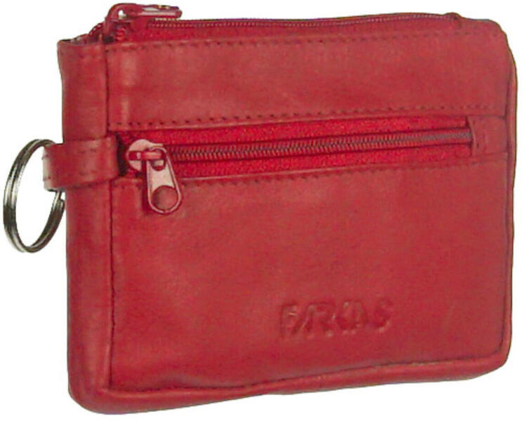Puha piros bőrből készült 3 részes kulcstartó. Kulcstartó része cipzárral zárható, amelyben egy fém lánccal rögzített kulcskarika található. Elején egy 5 cm, hátulján egy 6 cm magas lapos zseb helyezkedik el. Az egyik végén egy bőr fülön van még egy külső kulcskarika amit ez első zsebbe be lehet cipzározni.