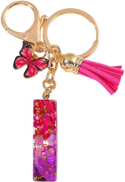 Fedezd fel a színek és csillogások varázsát minden részletben. Ezek a kulcstartók, amelyek az ábécé betűinek formáját öltik, ragyogó rózsaszín és lila színt kombinálnak arany csillámokkal, amelyek varázslatosan és energikusan hatnak. Minden betűt egy kifejező rózsaszín bojt és egy elegáns pillangó díszít – a könnyedség, szépség és változás szimbóluma.