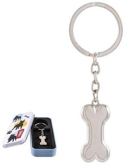 Kutyacsont formájú kulcstartó gazdiknak. Az ezüst színű, fém kulcstartó mókás kutyás mintájú fémdobozban található.