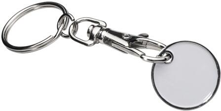 Kulcstartó egy karabinerről levehető bevásárlókocsi érmével. Az érme egyik oldala tökéletes hely a logó számára. Termék méret: 2,5 x 8,3 cmEmblémázási méret: 1 x 1 cm Emblémázását vállaljuk.