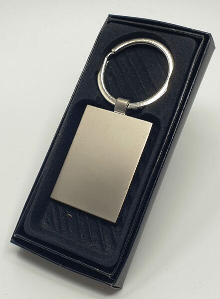 Gravírozható kulcstartó. Téglalap alakú gravírozható kulcstartó, fekete papír dobozban.