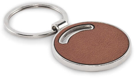 Kerek fém kulcstartó újrahasznosított PU-bőr betéttel.