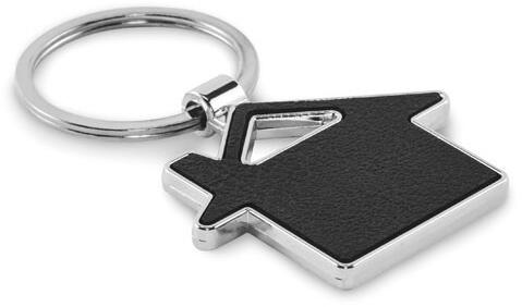 Ház alakú fém kulcstartó újrahasznosított PU bőr betéttel.