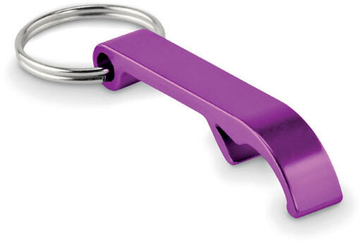 Újrahasznosított alumíniumból készült fényes kulcstartó üvegnyitóval.