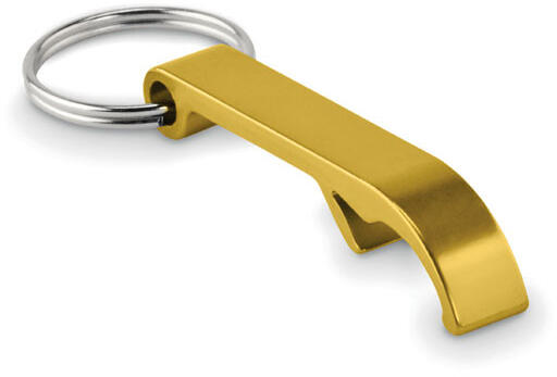 Újrahasznosított alumíniumból készült fényes kulcstartó üvegnyitóval.