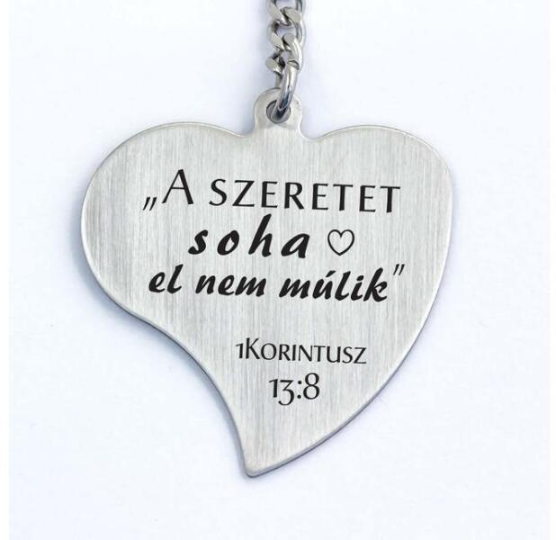 1Korintusz 13:8 Acél Medálos Kulcstartó – A Szeretet Örök Üzenete Ez a gravírozott acél kulcstartó egy megható és inspiráló ajándék, amely a Szent Pál szeretethimnuszának egyik legikonikusabb sorát hordozza: „A szeretet soha el nem múlik . Egy szívből jövő üzenet, amely emlékeztet arra, hogy a szeretet örök, és minden akadályon felülkerekedik. Prémium minőségű kivitelezés