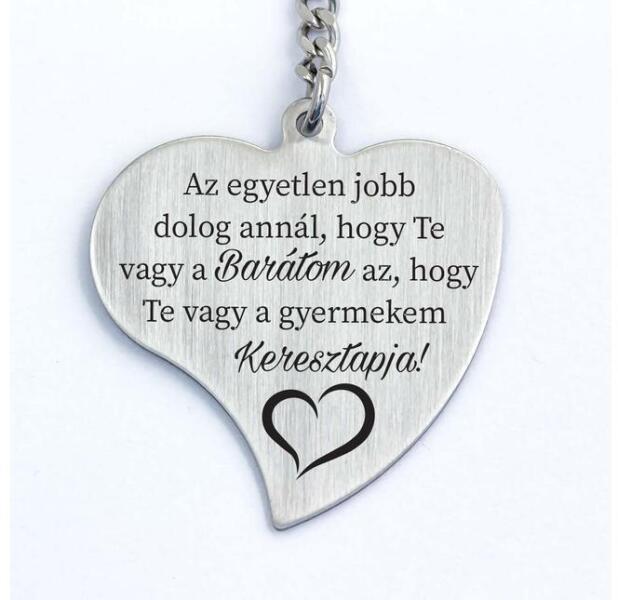 Egy barát, akire mindig számíthatsz – most már a gyermeked keresztapjaként is jelen van az életetekben. Ez a szív alakú kulcstartó egy különleges és érzelmes ajándék, amellyel kifejezheted, mennyire sokat jelent számodra az, hogy őt választottad erre a szerepre. Egy üzenet, amely emlékezteti őt nap mint nap: nemcsak barát, hanem család is. A gravírozott szöveg: „Az egyetlen jobb dolog annál, hogy Te vagy a Barátom az, hogy Te vagy a gyermekem Keresztapja! Ajándéknak tökéletes keresztelőre, keresztapa felkéréshez vagy megható köszönetnyilvánításként. Termékjellemzők