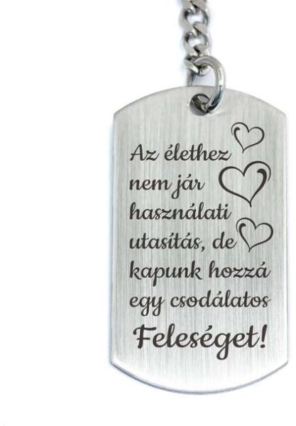 Csodálatos Feleséget – Gravírozott Acél Medálos Kulcstartó Szívhez szóló ajándék a szeretett feleségnek Ez a kulcstartó nem csupán egy praktikus tárgy, hanem egy érzelmekkel teli üzenet, amely nap mint nap emlékezteti viselőjét a szeretetre és megbecsülésre. A rozsdamentes acélból készült, téglalap alakú medálon lézergravírozással olvasható a következő felirat:„Az élethez nem jár használati utasítás, de kapunk hozzá egy csodálatos Feleséget!Ez a gondolat mély érzelmeket közvetít, és tökéletes ajándékká teszi különleges alkalmakra. Termékjellemzők: < ul>