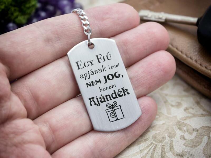 A számotokra állítottunk össze egy kedves meglepetést! Egy Fiú apjának lenni nem jog, hanem ajándék! Ma már az Édesapák is ott lehetnek a gyermekük születésénél, mely még szorosabbá teszi a Gyermekükkel a kapcsolatot. Apa minta, aki szeretettel taníthatja meg minden tudására, és aki méltán lehet büszke a legnagyobb ajándékra, amit életében kapott, a Fiára. Ezt a nagyszerű ajándék ötlet ünket egy gravírozott acél medál , és egy acél kulcstartó alk ot j a . A kulcstartót egy szögletes alakú 24×42 mm méretű elegáns acél medál díszíti, amit lézer gravírozunk . A nemesacél más néven orvosi fém medál nem allergizál , ezért fémre érzékenyeknek is bátran ajánljuk . Mindemellett az acél medál nagyon strapabíró , nem kopik , nem színeződik el , rendkívül hosszú ideig megőrzi eredeti szépségét .