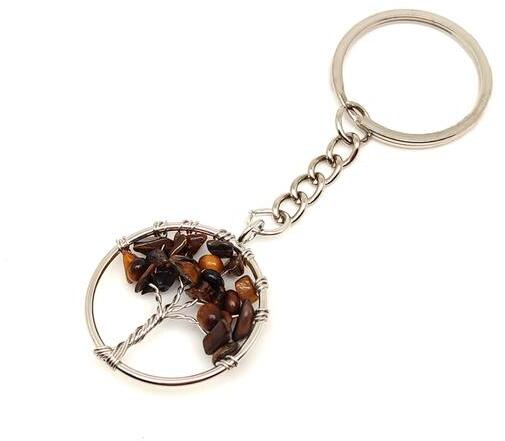 Életfa drótos Tigrisszem kulcstartó 3 cm – Meleg fényjáték, jelentéssel teli kiegészítőA tigrisszem különleges, aranybarna fényjátéka azonnal magára vonja a tekintetet. A kb. 3 cm-es , simára csiszolt kőre kézműves jellegű, finom drótfonnás Életfa motívum kerül, amely elegánsan öleli körbe a követ. A részletgazdag díszítés és a természetes ásvány színei együtt időtálló, karakteres kiegészítőt alkotnak, amely masszív kulcskarikával és rövid lánccal érkezik – így kulcson és táskadíszként is kényelmesen használható. Miért fogod szeretni?