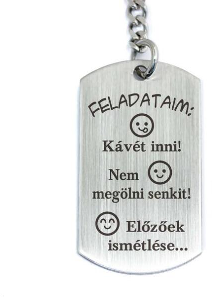 A számotokra állítottunk össze egy kedves meglepetést! Vannak azok a típusú emberek, akik az első reggeli kávéig nem önmaguk. Vannak, akiket doppingol, és olyanok is, akik egyszerűen csak szeretik az ízét: egy igazi erős feketét, vagy tejjel-cukorral, ízesítve, speciális pörköléssel, vagy tulajdonképpen bárhogyan és bármikor. Találj telibe ezzel az ajándékötletünkkel, aztán kacagjatok és kávézzatok egyet együtt! :) Ezt a nagyszerű ajándék ötlet ünket egy gravírozott acél medál , és egy acél kulcstartó alk ot j a . A kulcstartót egy szögletes alakú 35×20 mm méretű elegáns acél medál díszíti, amit lézer gravírozunk . A nemesacél más néven orvosi fém medál nem allergizál , ezért fémre érzékenyeknek is bátran ajánljuk . Mindemellett az acél medál nagyon strapabíró , nem kopik , nem színeződik el , rendkívül hosszú ideig megőrzi eredeti szépségét . < p>