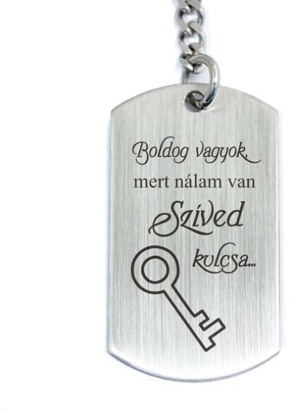 " Boldog vagyok, mert nálam van Szíved kulcsa " acél szögletes medálos kulcstartó