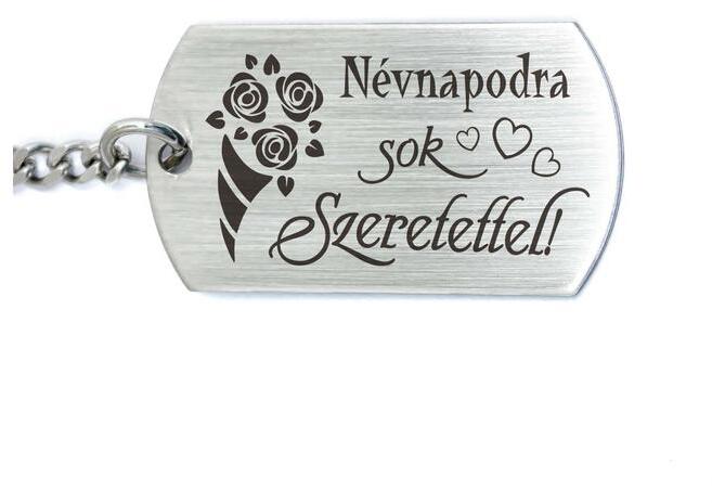 " Névnapodra sok szeretettel! " feliratos acél szögletes medálos kulcstartó
