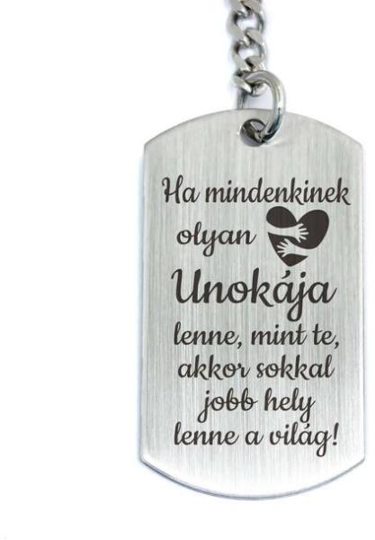 Ha mindenkinek olyan Unokája lenne – Gravírozott Acél Medálos Kulcstartó Szívhez szóló ajándék a szeretett nagyszülőnek Ez a kulcstartó nem csupán egy praktikus tárgy, hanem egy érzelmekkel teli üzenet, amely nap mint nap emlékezteti viselőjét a szeretetre és megbecsülésre. A rozsdamentes acélból készült, téglalap alakú medálon lézergravírozással olvasható a következő felirat:„Ha mindenkinek olyan Unokája lenne, mint te, akkor sokkal jobb hely lenne a világ!Ez a gondolat mély érzelmeket közvetít, és tökéletes ajándékká teszi különleges alkalmakra. Termékjellemzők: < ul>