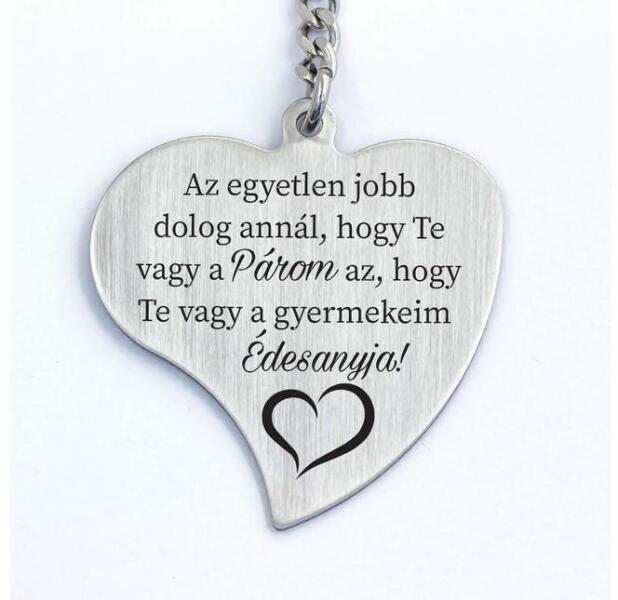 Vannak pillanatok, amikor a legszebb ajándék egy egyszerű, őszinte mondat. Ez a szív alakú kulcstartó épp ilyen üzenetet közvetít – egy szeretett társ felé, aki nemcsak párod, hanem gyermekeid édesanyja is. A gravírozott felirat: „Az egyetlen jobb dolog annál, hogy Te vagy a Párom az, hogy Te vagy a gyermekeim Édesanyja! – egy szeretetből és tiszteletből született vallomás, amely mindennap emlékezteti viselőjét a családi kötelékek szépségére. Ez a kulcstartó ideális ajándék...