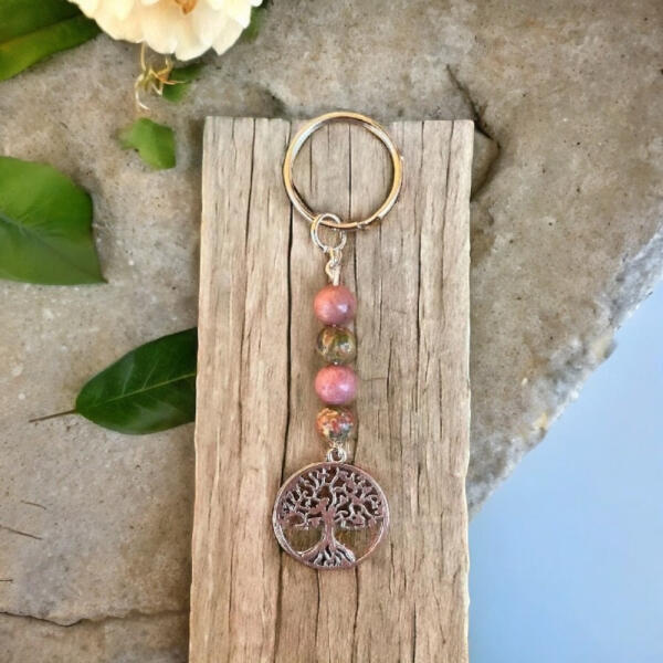 A gyöngyök átmérője: körülbelül 8mm Rodonit tulitból és Unakitból készült kulcstartó, életfa medállal díszítve. A kulcstartó rész nemesacélból készült.