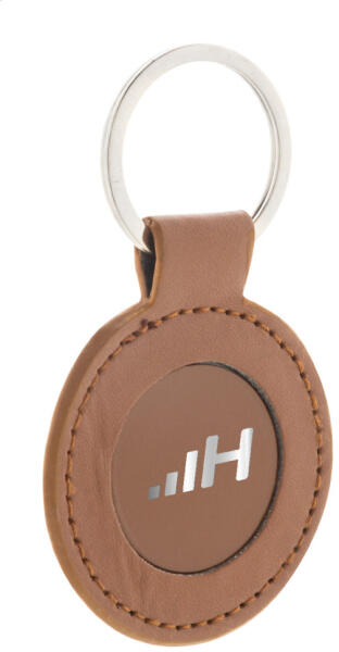 Kör alakú, újrahasznosított PU bőr kulcstartó fém karikával és gumírozott rozsdamentes acél logóval. Speciális bevonattal a tükörlézeres gravírozáshoz.